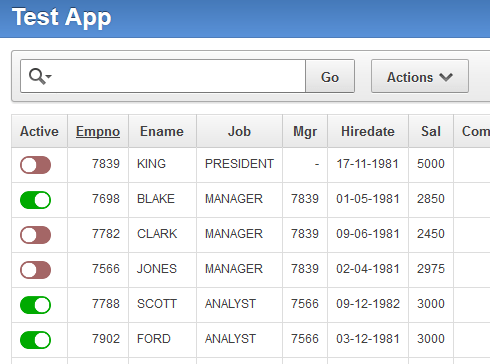 En nuestro ejemplo vamos a reemplazar la columna EMP.ACTIVE del informe por un botón que nos permita cambiar el valor entre ‘YES’ y ‘NO’ pulsando sobre él. Además, incluiremos una petición de confirmación previa para evitar que se ejecute por error.
